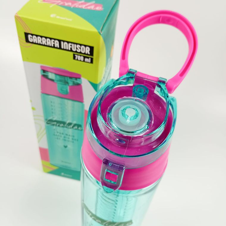 Garrafa com Infusor – 700 ml Perfeita para água saborizada com frutas. ervas ou chá. Prática para o dia a dia. academia ou trabalho. Capacidade: 700 ml Tamanho: 25 cm x 6.5 cm Contém: 1 garrafa. 1 tampa e 1 infusor Lavar à mão | Não vai ao micro-ondas ou lava-louças